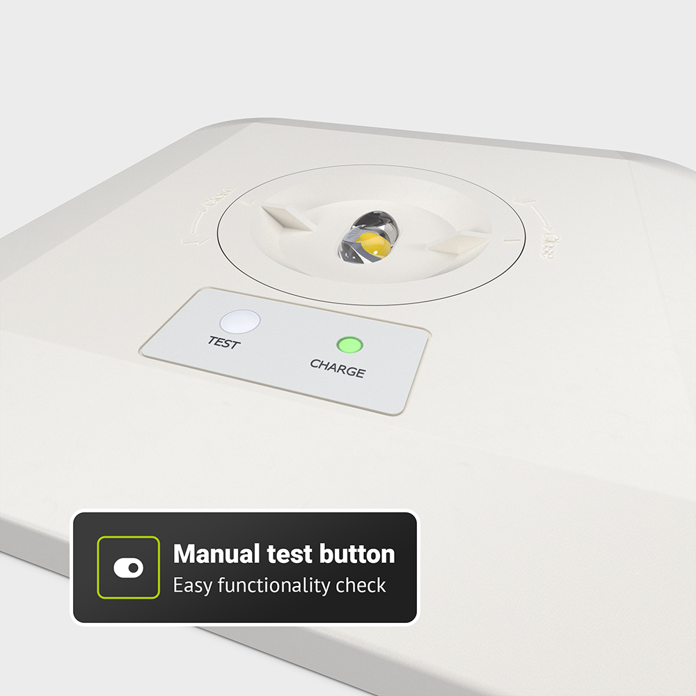 De Fuga opbouwspot heeft een testknop waarmee je handmatig kunt controleren of de noodverlichting automatisch inschakelt bij stroomuitval. Het is verplicht om maandelijks handmatig een functietest en jaarlijks een duurtest van drie uur uit te voeren.