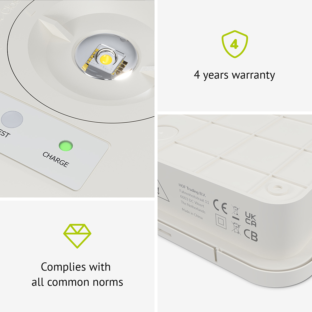 Dankzij deze hoogwaardig kwalitatieve LiFePO4 batterij heeft de Fuga een lange levensduur en weinig onderhoud. Daarnaast verbruikt de lamp slechts 1,6 watt waardoor hij zeer energiezuinig is en dus tevens langer meegaat. De behuizing van de Fuga is gemaakt van behoorlijk polycarbonaat. Tot slot heeft de lamp > 102000 branduren, waardoor je jarenlang geen omkijken hebt naar deze lamp. Op deze noodverlichting ontvang je 4 jaar garantie (2 jaar op de batterij).