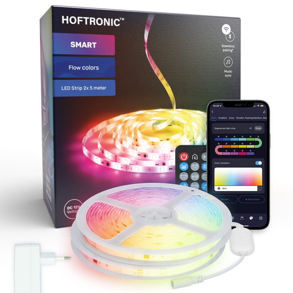 HOFTRONIC HOFTRONIC – Smart LED Strip 10m (2x5m) – RGB Flow Color – WiFi + Bluetooth- 12V – 16,5 miljoen kleuren met 240 LEDs – Music Sync – Met afstandsbediening – Zelfklevend – Voor Google Home, Amazon Alexa en Siri