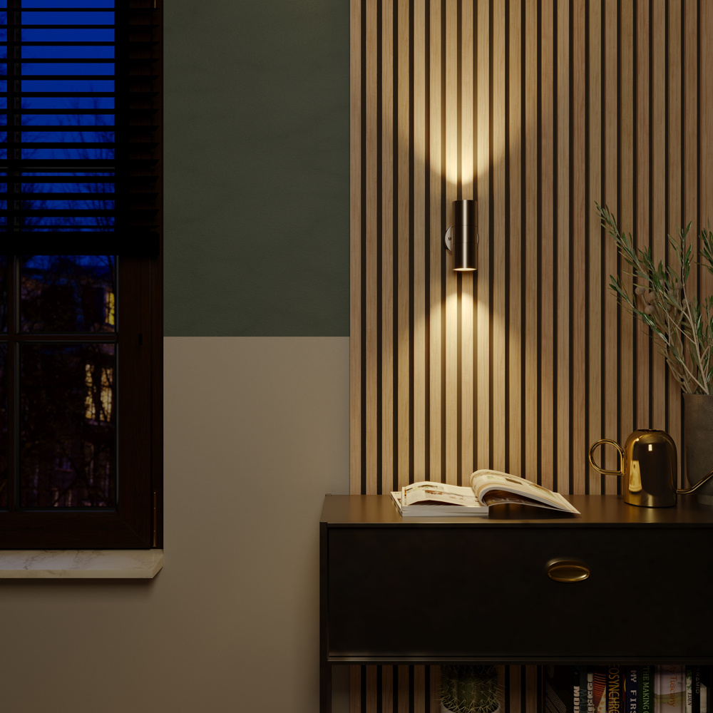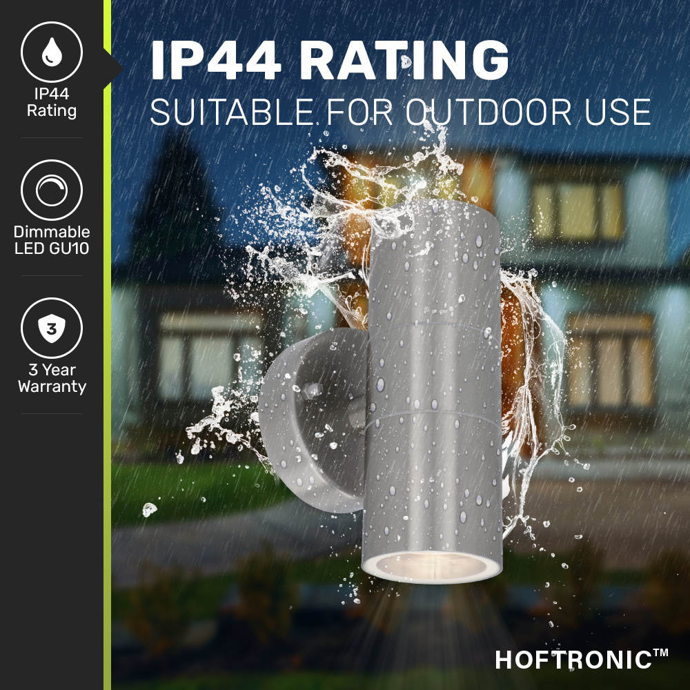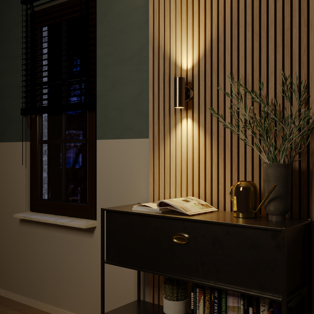 Ben je opzoek naar een wandlamp voor buiten welke een moderne uitstraling heeft. Dan is deze wandlamp precies wat je zoekt! Door zijn elegante cilindervorm is deze buitenlamp een echte eye-catcher. Met de twee bijgeleverde dimbare GU10 LED spots kun je nu zelf eenvoudig de sfeer bepalen op de juiste dimstand.