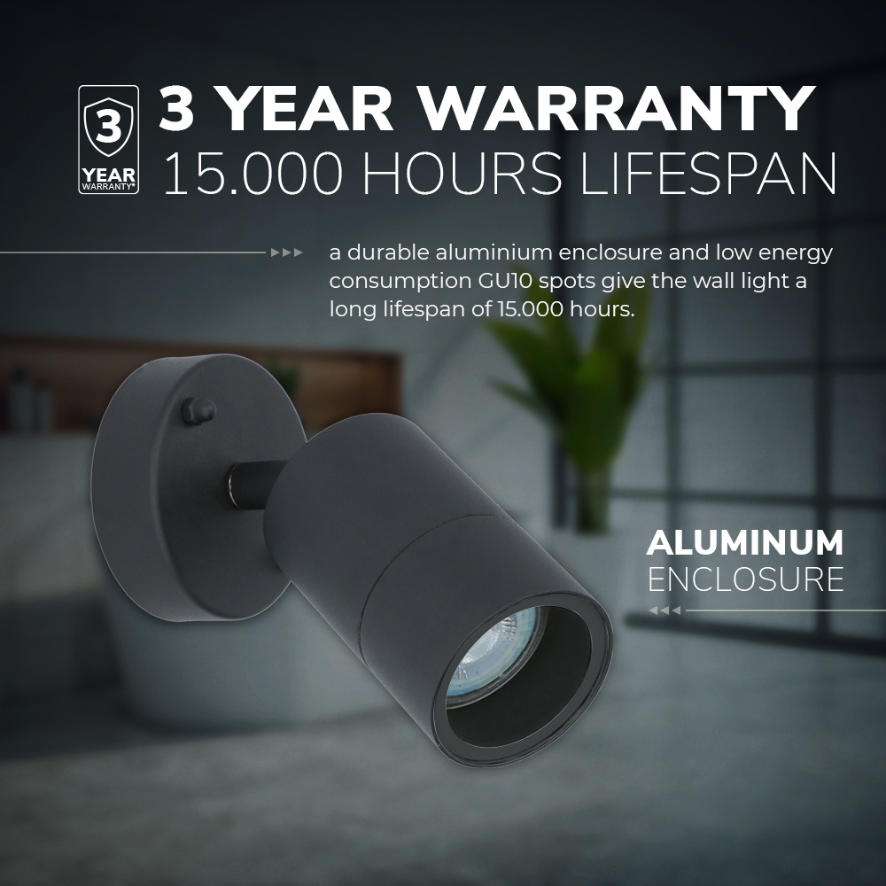 Het armatuur van deze Lago wandspot is gebouwd uit onderhoudsvrij aluminium. Dit uitrusting heeft als eigenschap dat vuil en stof zich slecht hecht. Hierdoor hoef je de spots minder vaak schoon te maken en kun je lang genieten van de mat zwarte kleurnuance van het armatuur.