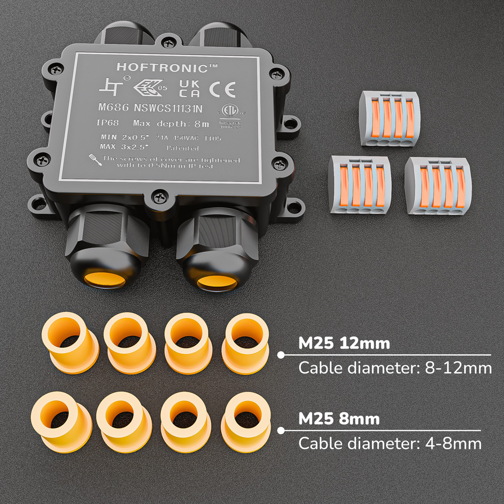 Met deze lasdoos kun je op een waterdichte en veilige manier 4 buiten-/ installatiekabels in je tuin verbinden. Ideaal voor het simpelweg van stroom voorzien van brede apparaten buiten. Dankzij de hoge IP68-beschermingsklasse is hij afgeladen waterdicht, waardoor je hem zonder problemen buiten of ondergronds kunt gebruiken. De lasdoos is bruikbaar voor 2-aderige en 3-aderige kabels (neutraal, fase, aarding) met een draaddikte van 0,5 mm² tot 2,5 mm², of kabels met een volledige dikte van 4 mm tot 12 mm. Met de meegeleverde rubberen inzetstukken kun je de lasdoos aangenaam aanpassen aan verschillende kabeldiktes.