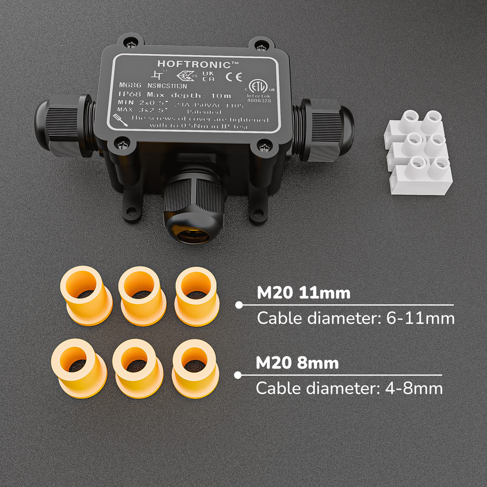 Met deze lasdoos kun je op een waterdichte en veilige manier 3 buiten-/ installatiekabels in je tuin verbinden. Ideaal voor het doodeenvoudig van stroom voorzien van uiteenlopende apparaten buiten. Je kunt van één kabel moeiteloos twee kabels maken. Dankzij de hoge IP68-beschermingsklasse is hij waterdicht, waardoor je hem zonder obstakel buiten of ondergronds kunt benuttigen. De lasdoos is juist voor 2-aderige en 3-aderige kabels (neutraal, fase, aarding) met een draaddikte van 0,5 mm² – 2,5 mm² of een kabeldikte van 4 tot 11 mm. Met de meegeleverde rubberen inzetstukken kun je de lasdoos comfortabel aanpassen aan meerdere kabeldiktes.