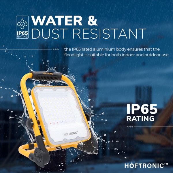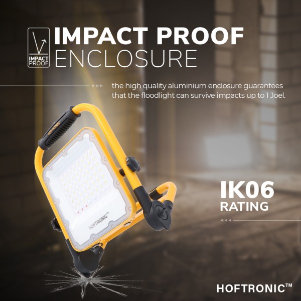De bouwlampen zijn voorzien van een IP65 beschermingsklasse. Hierdoor zijn de bouwlampen stofdicht en waterdicht. De 6 geeft de stofdichtheid van de lamp aan. In dit geval betekent dit dat de lampen compleet stofdicht is. De vijf geeft de waterdichtheid van de lamp aan. Dit betekent dat de bouwlampen bestand zijn tegen onmiddelijk contact met water. Je kunt de statief met bouwlampen dus gerust buiten in de regen laten staan. De bouwlampen kunnen ingezet worden in temperaturen tussen de -20 en 40 graden Celcius.