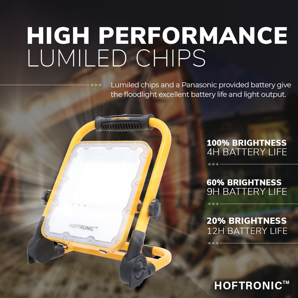 De bouwlampen op accu zijn voorzien van 56 LumiLEDs per lamp. Deze state-of-the-art LEDs zijn een van de zuinigste LEDs op de markt. Hierdoor verbruiken de breedstralers zeer weinig en creëert deze hiermee maar liefst 1020 lumen aan licht. Dit zorgt er ook voor dat de bouwlampen tot wel 12 uur branden op één acculading.