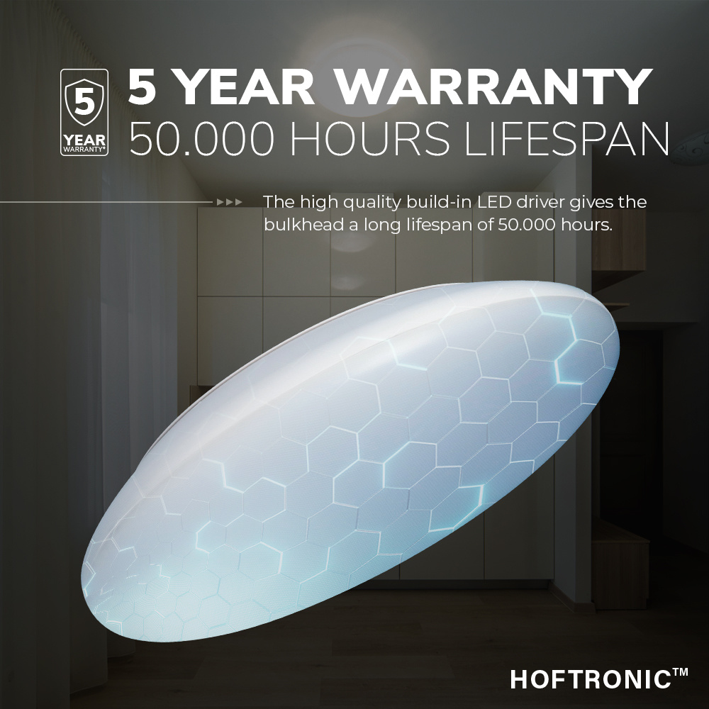 Deze LED bulkhead is van het kwalitatieve merknaam HOFTRONIC. HOFTRONIC is fabrikant en verkoper van LED verlichting. Hierdoor profiteer je van de scherpste koopprijs, hoogste klasse en mooiste garantievoorwaarden. Op deze LED plafondlamp ontvang je dan ook 3 jaar garantie. Defecten worden binnen deze 3 jaar voor niets substitueren.