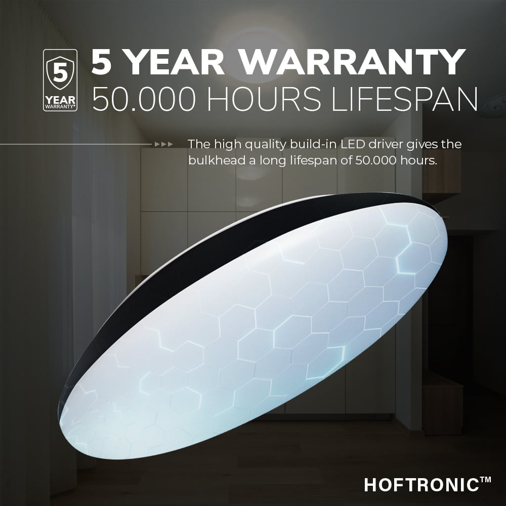 Deze LED bulkhead is van het hoogwaardige merk HOFTRONIC. HOFTRONIC is fabrikant en verkoper van LED verlichting. Hierdoor profiteer je van de scherpste prijs, hoogste klasse en mooiste garantievoorwaarden. Op deze LED plafondlamp ontvang je dan mede 3 jaar garantie. Defecten worden in huis deze 3 jaar kosteloos verwisselen.