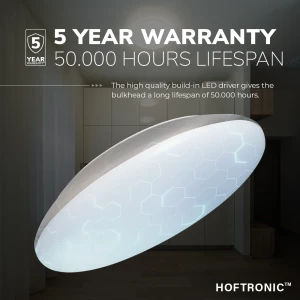 Deze LED bulkhead is van het hoogwaardige merk HOFTRONIC. HOFTRONIC is fabrikant en verkoper van LED verlichting. Hierdoor profiteer je van de scherpste koopprijs, hoogste klasse en eersterangs garantievoorwaarden. Op deze LED plafondlamp ontvang je dan ook 3 jaar waarborg. Defecten worden in huis deze 3 jaar kosteloos verwisselen.