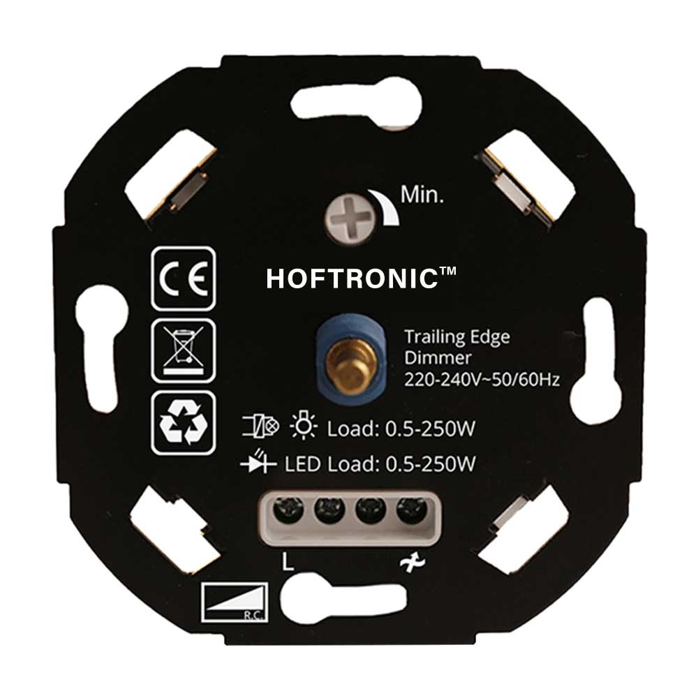 De dimmer maakt gebruik van smooth dimming. Deze technologie waakt ervoor dat je lampen traploos kunt dimmen. Door hanteer te maken van fase afsnijding (trailing edge) doet deze LED dimmer dit geluidloos. Bij dimmers zonder trailing edge hoor je immers de ontstoringsspoel. De HOFTRONIC Eco dimmer maakt echter gebruik van elektronische componenten, waardoor je bij het dimmen geen zoemende en hinderende geluiden hoort.