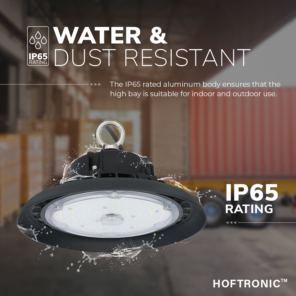 Deze veelomvattende LED High bay is uitgevoerd met een IP65 normering waardoor deze spatwater en stofdicht is en hierdoor perfect kan worden ingezet in vochtige ruimtes. Deze LED High bay is voorzien van een krachtige transformator welke een powerfactor heeft van >0.9, om die reden kun je een grote hoeveelheid van deze High Bays op een groep aansluiten. Tevens is deze professionele LED High bay totstandgekomen met zeer krachtige LumiLEDs 2835 High lumen Leds welke 140 lumen per Watt afgeven. De lichtkleur van deze LED High bay is 4000K neutraal wit.