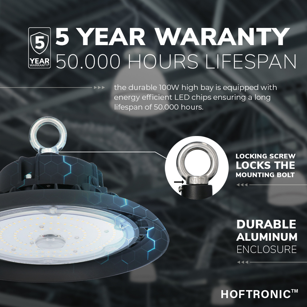 De LED chips welke er in deze LED Higbay zijn toegepast zijn originele LumiLEDs 2835 high lumen Leds. Deze LED’s hebben een hoge lichtopbrengst van maar liefst 140lm/W. Deze 100 Watt LED High bay geeft dan bovendien een maximale lichtopbrengst van 14.000 Lumen. Door gedetailleerd hanteer te maken van de hoogste kwaliteit componenten ben je verzekerd van een minimale levensduur van 50.000 branduren en 5 garantie.