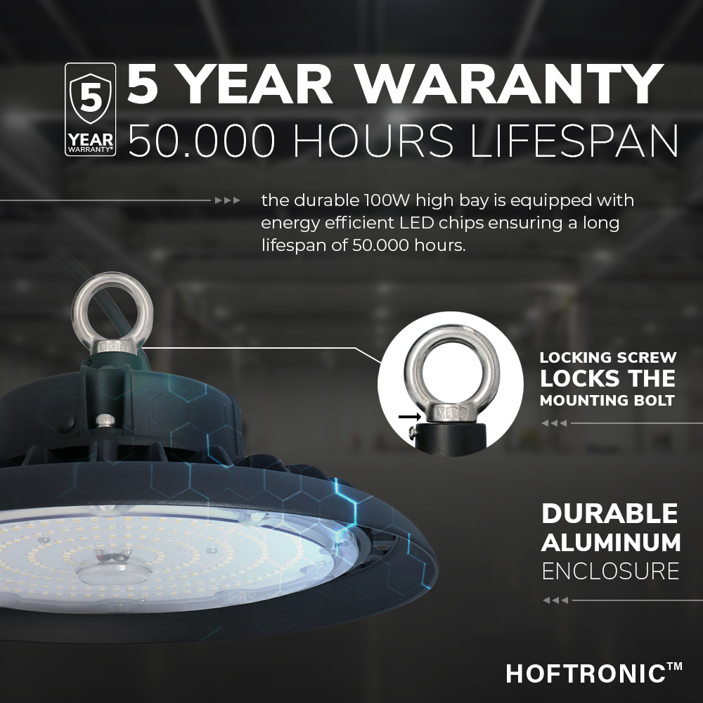 De LED chips welke er in deze LED Higbay zijn toegepast zijn originele LumiLEDs 2835 high lumen Leds. Deze LED’s hebben een hoge lichtopbrengst van maar liefst 140lm/W. Deze 150 Watt LED High bay geeft dan mede een totale lichtopbrengst van 21.000 Lumen. Door zorgvuldig utiliseer te maken van de hoogste kwaliteit componenten ben je verzekerd van een minimale levensduur van 50.000 branduren en 5 garantie.