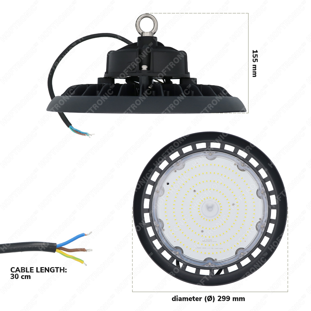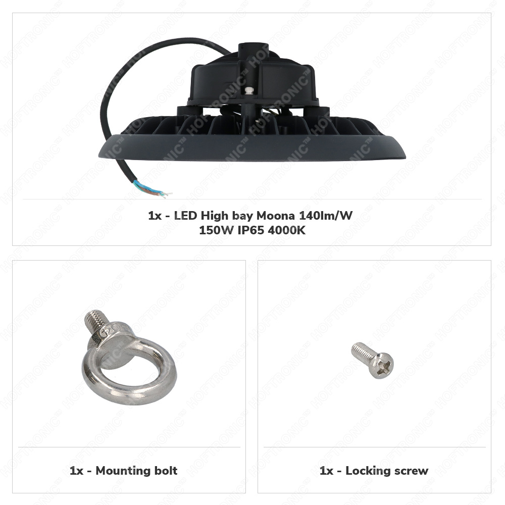 De LED High Bay wordt normaal geleverd met een ophangoog wat de montage van deze High Bay lampen heel eenvoudig maakt. De High Bay wordt standaard gebracht met 30 centimeter H05RN-F 3×1.0mm² kabel. Voor een snelle montage raden wij je een IP68 kabelverbinder aan, hiermee ben je verzekerd van een veilige en waterdichte verbinding.