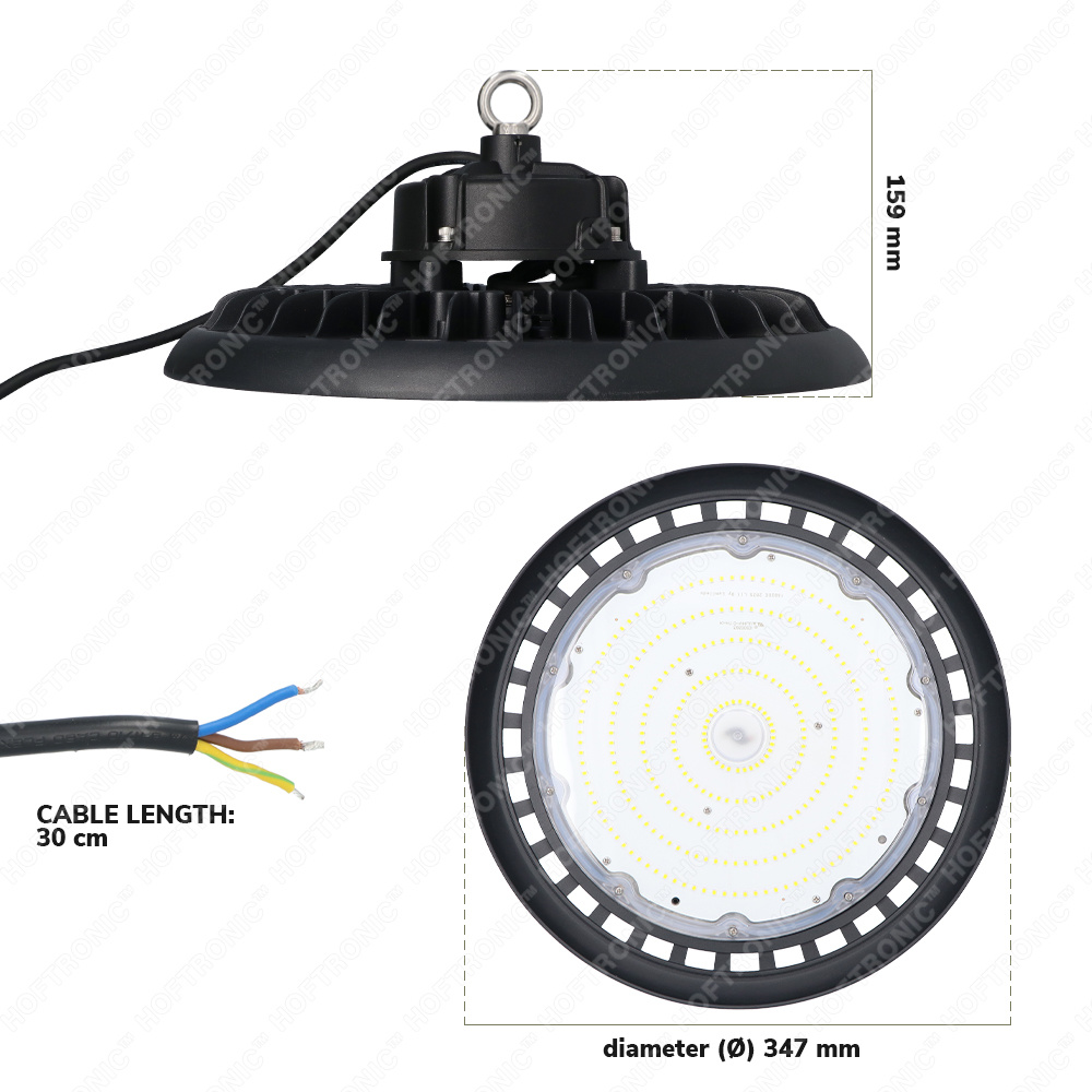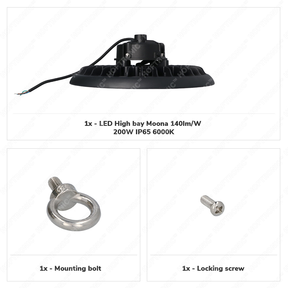 De LED High Bay wordt standaard geleverd met een ophangoog wat de montage van deze High Bay lampen heel aangenaam maakt. De High Bay wordt normaal bezorgd met 30 centimeter H05RN-F 3×1.0mm² kabel. Voor een snelle montage raden wij je een IP68 kabelverbinder aan, hiermee ben je verzekerd van een veilige en waterdichte verbinding.