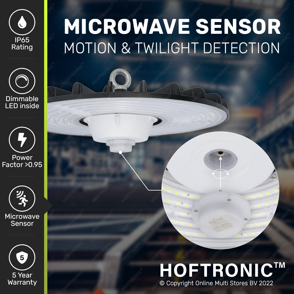 De detectieafstand van de sensor ligt tussen de 1-8 meter en afhankelijk van de montage is de detectiehoek tussen de 150° en 360°. Door zijn IP65 waarde waakt de sensor ervoor dat de high bay nog altijd compleet waterdicht is, tevens na installatie van de sensor. Je plugt de sensor in de aansluiting van de High bay en draait deze vervolgens extra dicht door middel van de schroefaansluiting. Deze 1-10 Volt microgolfsensor & daglichtsensor is goed voor de 80-200 Watt HOFTRONIC™ LED High bay’s met 200 lumen per Watt.