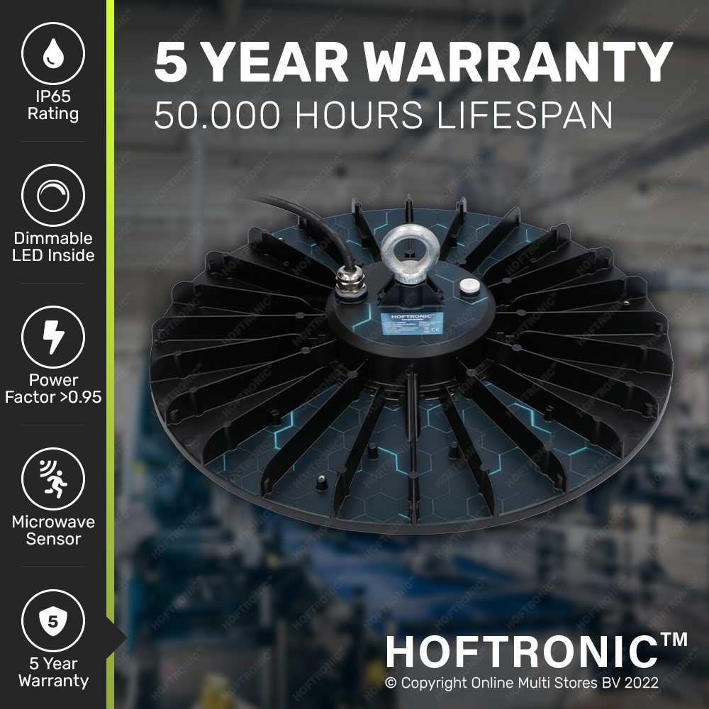 De High bay Cali biedt maar liefst 50.000 branduren. Dagelijks mag hij 10 tot optimaal 12 uur branden. Dit komt neer op gemiddeld 12,5 jaar genot van jouw High bay bij optimaal gebruik. Mocht er toch iets defect gaan aan de High bay dan biedt Hoftronic 5 jaar borgstelling.