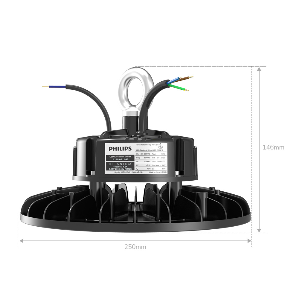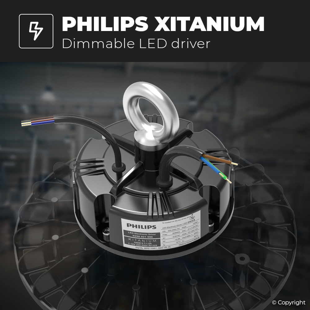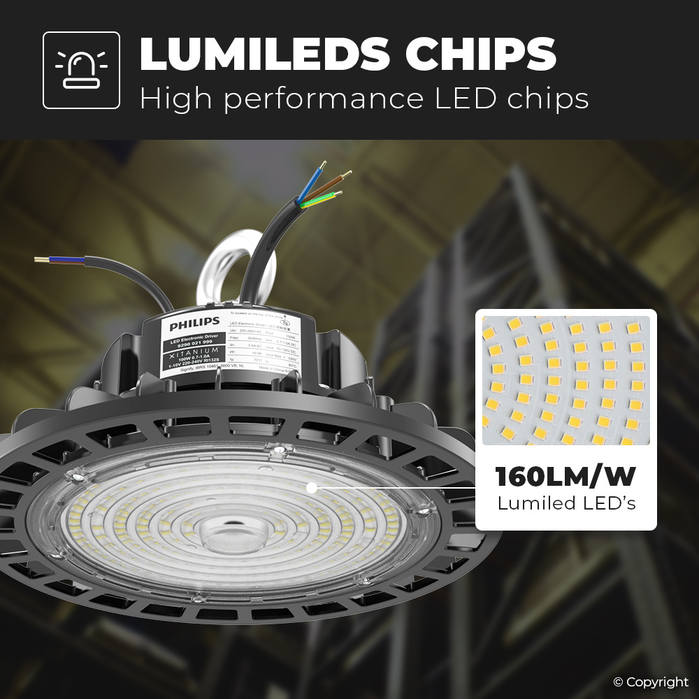 Deze LED high bay beschikt over de nieuwste generatie Philips drivers. Lang bedien, weinig verbruik en flikkervrij licht gegarandeerd. Deze LED high bay verbruikt slechts 100 Watt en produceert 16.000 lumen aan licht. Een efficiëntie van 160 lumen per watt. Hiermee vervangt deze LED stoere lamp een 550 Watt high bay of tl lamp. Een besparing van maar liefst 90% op energiekosten. De LED High bay is vol IP65 waterdicht. Hierdoor zijn defecten door natheid en stof uitgesloten.