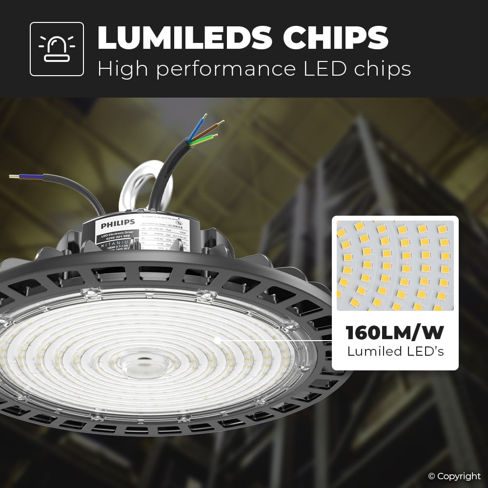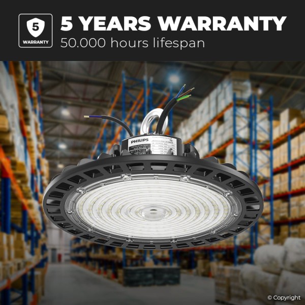 Deze LED high bay beschikt over de nieuwste generatie Philips drivers. Lang bedien, weinig verbruik en flikkervrij licht gegarandeerd. De LED driver van deze high bay is vol traploos dimbaar van 100-10%. Hierdoor kun je ruimtes waar niet de hele dag licht nodig is dimmen tot bijvoorbeeld 20% en andere ruimtes extreem en vol van licht voorzien. Het dimmen zorgt er ogenblikkelijk voor dat de LED high bay minder stroom verbruikt. (20% licht is 20% verbruik).