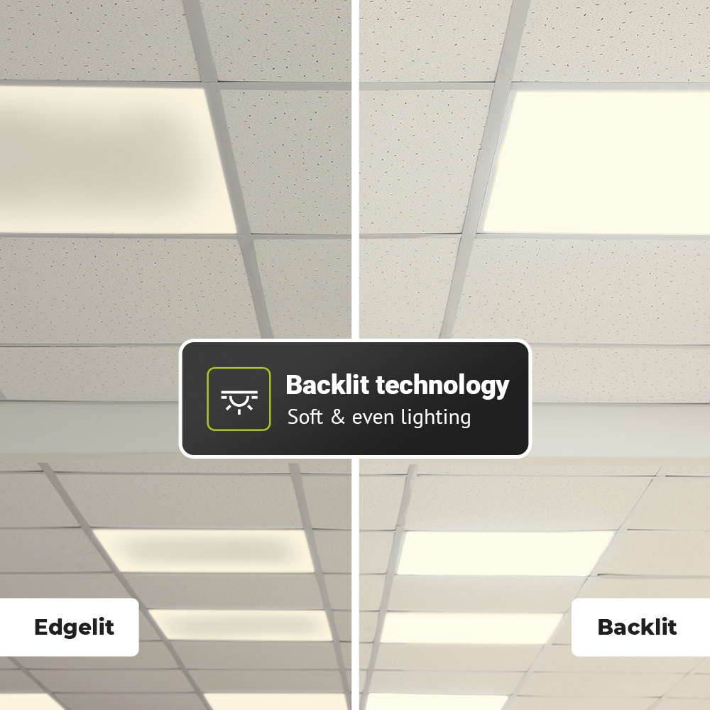 • Back-lit paneel: Deze LED panelen zijn voorzien van de nieuwste back-lit technologie wat zorgt voor een mooi diffuus licht dat zich gelijk verspreid. Je ziet dus geen donkere vlekken in het licht en het paneel zal in de loop van de tijdruimte niet verkleuren.