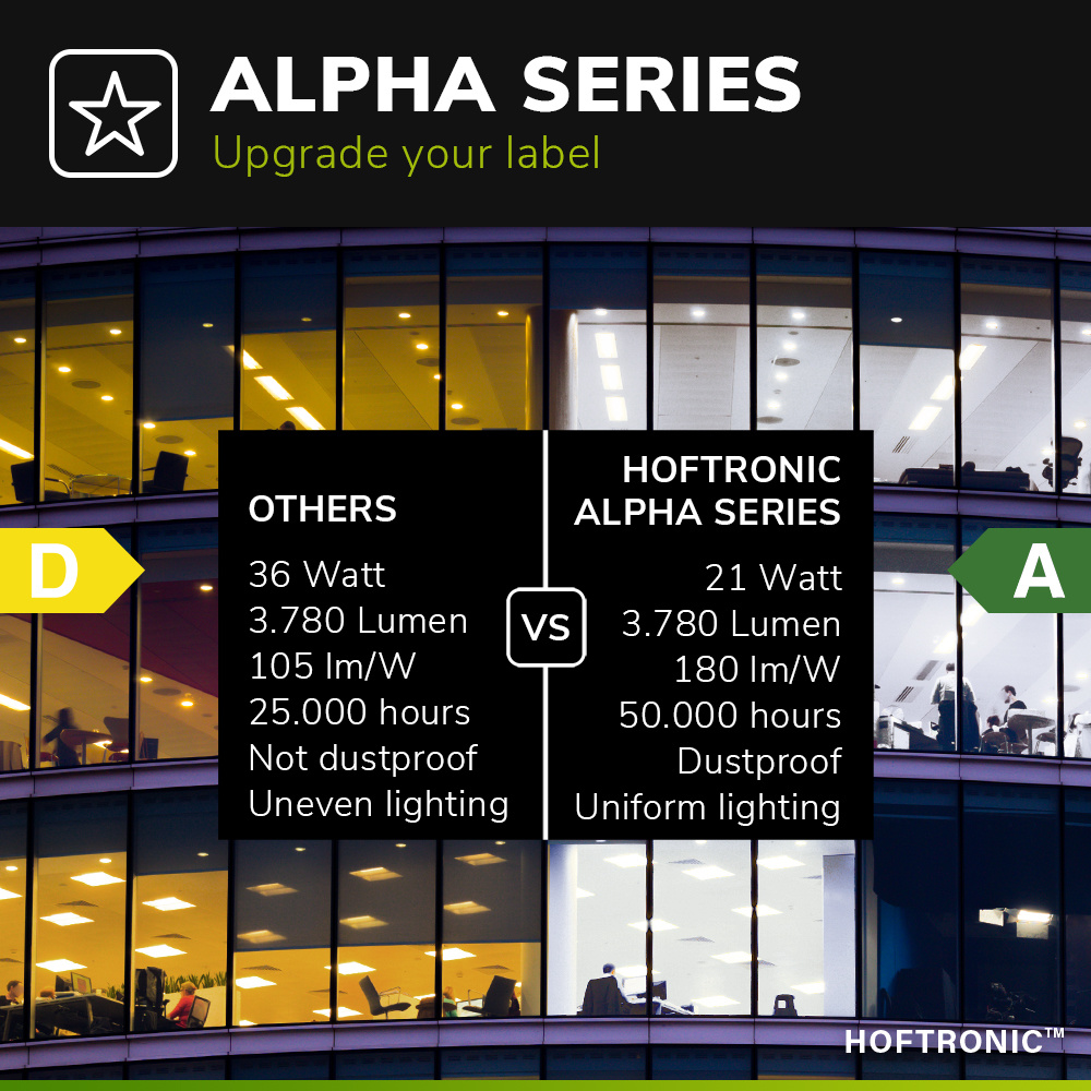 Dit nieuwste pasvorm LED paneel is energiezuiniger dan ooit en heeft een exceptioneel energielabel A. Waar reguliere TL verlichting een opbrengst heeft van 30 lm/w, hebben deze LED panelen een verbruik van 180 lm/w. Dit is een besparing van ruim 80% in het energieverbruik. Zelfs vergeleken met reguliere LED panelen bespaart u al 30%. Misschien is dit net dat ene zetje dat je nodig hebt voor je energielabel C op kantoor?