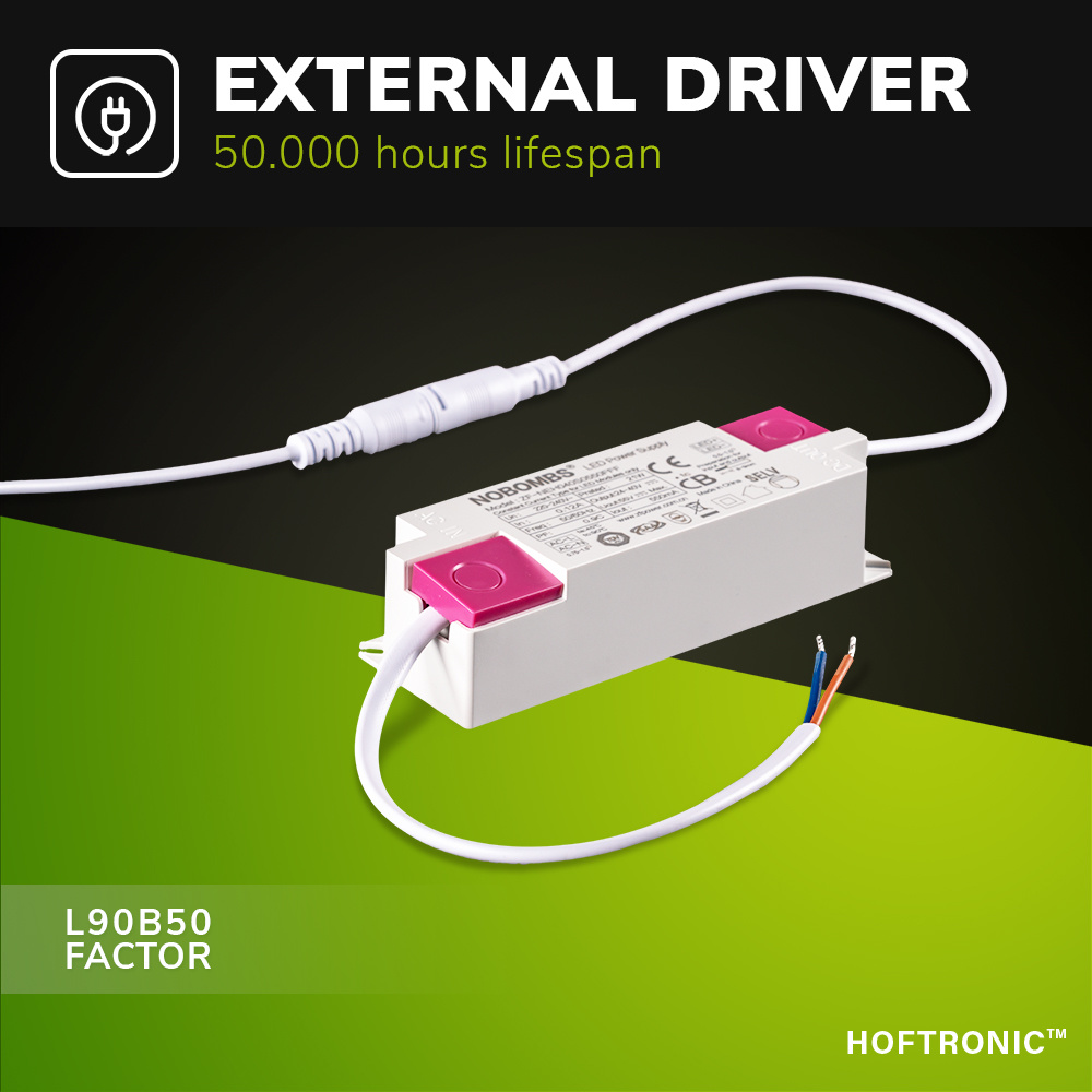 De bijgeleverde externe driver zorgt ervoor dat het paneel op een veilige aanpak op het juiste voltage aan wordt gesloten. De spanning wordt hiervoor omgezet van 230V naar 24-40V. Een ander voordeel van de externe driver in plaats van een ingebouwde driver is dat deze leuker kan koelen en heeft hij een langere levensduur dan een led paneel met ingebouwde driver. Mocht onverhoopt de driver toch verwisselen dienen te worden dan hoeft men niet het hele paneel te afwisselen, dat is wel zo duurzaam!