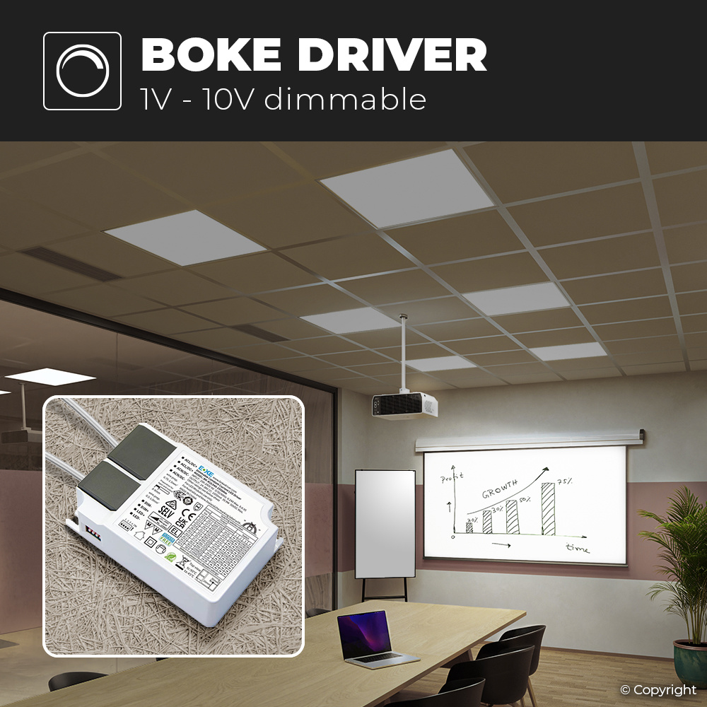 De meekomende externe driver zorgt ervoor dat het paneel op een veilige aanpak op het juiste voltage aan wordt gesloten. De spanning wordt hiervoor omgezet van 230V naar 24-38V. Een ander voordeel van de externe driver in plaats van een ingebouwde driver is dat deze beter kan koelen en heeft hij een langere levensduur dan een led paneel met ingebouwde driver. Mocht onverhoopt de driver toch vervangen dienen te worden dan hoeft men niet het hele paneel te vervangen, dat is wel zo duurzaam!