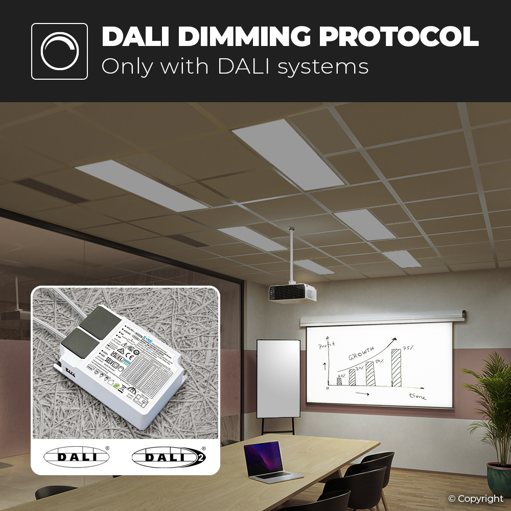 Deze compacte en krachtige driver is ontwikkeld om naadloos samen te werken met Dali controllers thuis je verlichtingssysteem. Onze Dali driver biedt vele functionaliteiten om je te helpen de uitmuntende verlichtingsomgeving voor elke ruimte te creëren. Met traploos dimmen en de mogelijkheid om de LED panelen te groeperen kun je jouw verlichting eenvoudig aanpassen aan een specifieke locatie of taak. Het installeren van de driver is eenvoudig; koppel eerst het LED paneel via de DC plug aan de driver, vervolgens sluit je de stroom aan om te kijken of de installatie werkt. Tenslotte kunnen de twee draden van de Dali controller worden aangesloten op de driver, je kunt regelrecht gebruik maken van alle functionaliteiten die het Dali systeem bied!