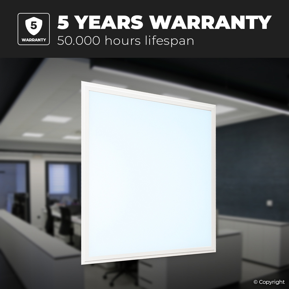 Dit extra dunne LED paneel met smal frame van 62×62 cm heeft een koud witte kleurtemperatuur van 6500K en een lichtopbrengst van 4320lm (120lm/w), afgezien van te flikkeren. Het paneel heeft als uniek kleurschakering dat de verlichting niet belastend is en verblinding of lichthinder tegengaat in een ruimte. Op dit paneel geven wij met een gerust hart 5 jaar garantie.