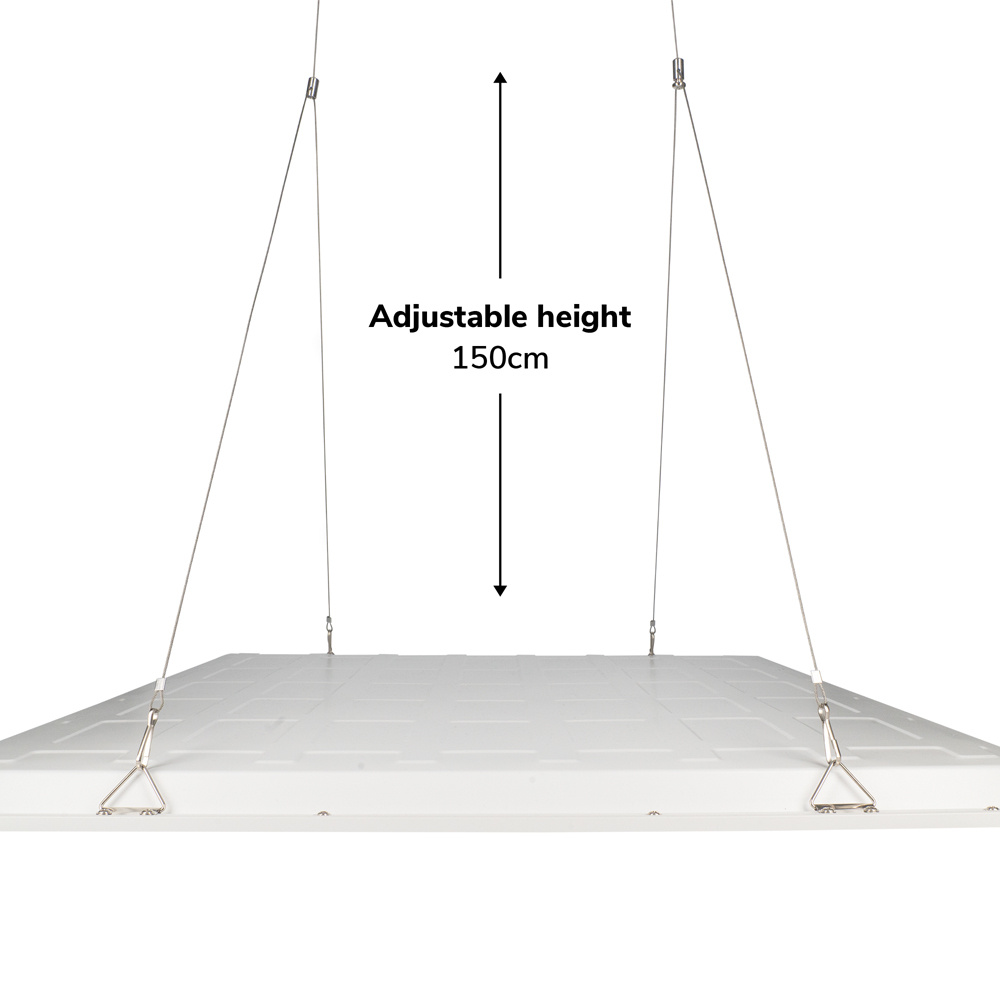 Dit LED Paneel ophangsysteem is een accessoire waarmee je heel eenvoudig LED Panelen kunt bevestigen tegen ieder soort plafond, dit is erg handig wanneer je het led paneel niet in een systeemplafond kunt verwerken of wanneer je geen hanteer wilt maken van een opbouwframe maar goed het paneel verlaagd wilt ophangen. De hoogte om de LED Panelen af te hangen van het plafond is variabel verstelbaar tot maximaal 150 centimeter. De ophangset is mogelijkheid4 voor de HOFTRONIC 36 Watt LED panelen in de formaten 60×60 cm, 62×62 cm en 30×120 cm.