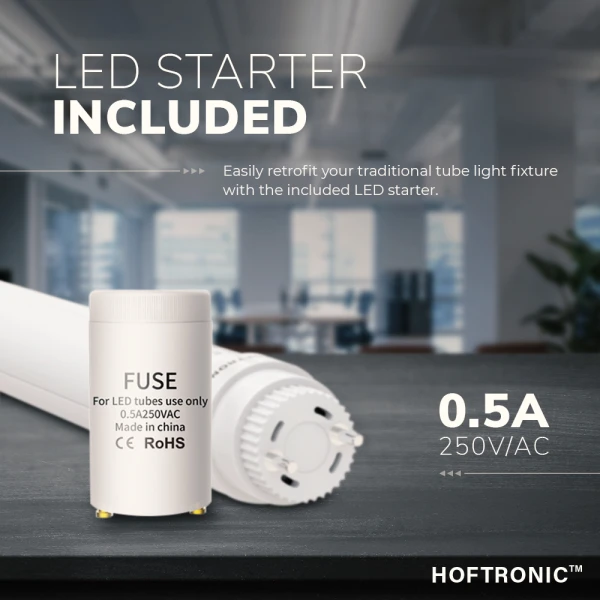 Door de meegeleverde dummy starter kun je deze LED TL buis regelrecht aansluiten op een traditioneel T8 armatuur. Bij het aansluiten van de TL LED buis op een Hoftronic armatuur heb je géén dummy starter meer nodig. Je hebt hier meerdere installatiemogelijkheden voor. Deze hebben we uitgelegd in onze blog: TL Verlichting substitueren voor LED buizen.