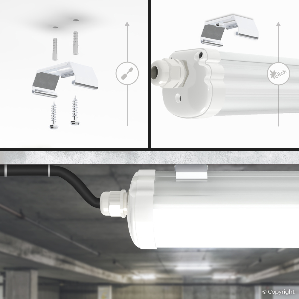 Door middel van de RVS montageclips klik je het armatuur aangenaam tegen het plafond. Deze is er vervolgens tevens simpelweg af te halen. Hierdoor kun je het armatuur moeiteloos schoonmaken. Dit waterdichte LED TL armatuur kun je regelrecht op het 230 volt lichtnet aansluiten.