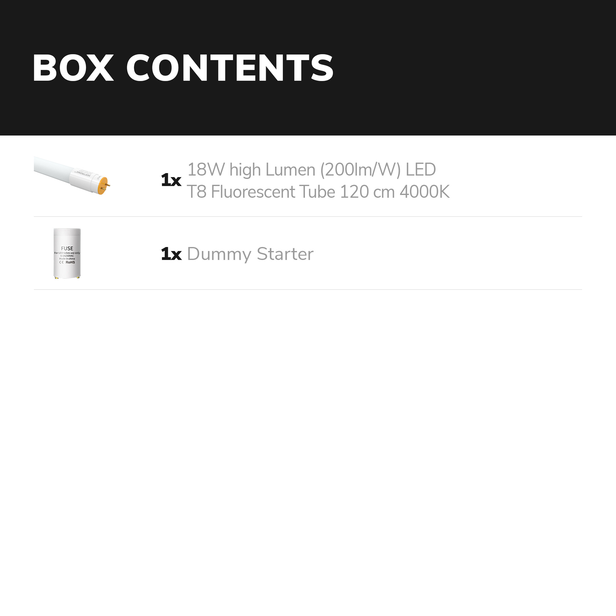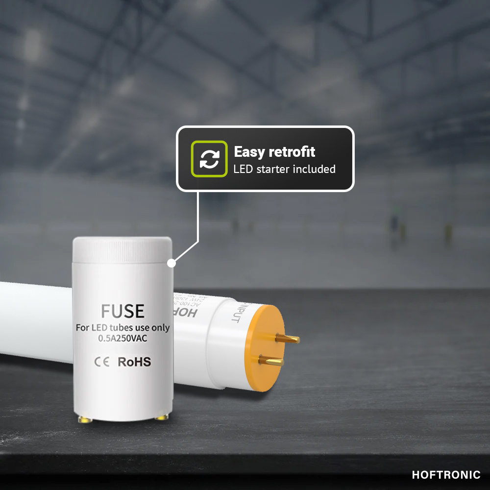 Door de meegeleverde dummy starter kun je deze LED TL buis onmiddelijk aansluiten op een traditioneel T8 armatuur. Je hebt hier verscheidene installatiemogelijkheden voor. Deze hebben we uitgelegd in onze blog: TL Verlichting afwisselen voor LED buizen.