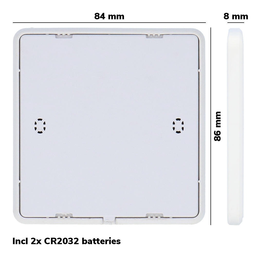 De draadloze LED muurdimmer heeft een grootte van 86 x 86 x 8 mm. Dit geeft de dimmer een strak en modern uiterlijk. Doordat de lichtregelaar gemonteerd wordt met dubbelzijdige tape aan de achterzijde, valt deze mooi weg tegen de muur. De dimmer is voorzien van een touch control panel, waardoor het kastje één strak geheel vormt.