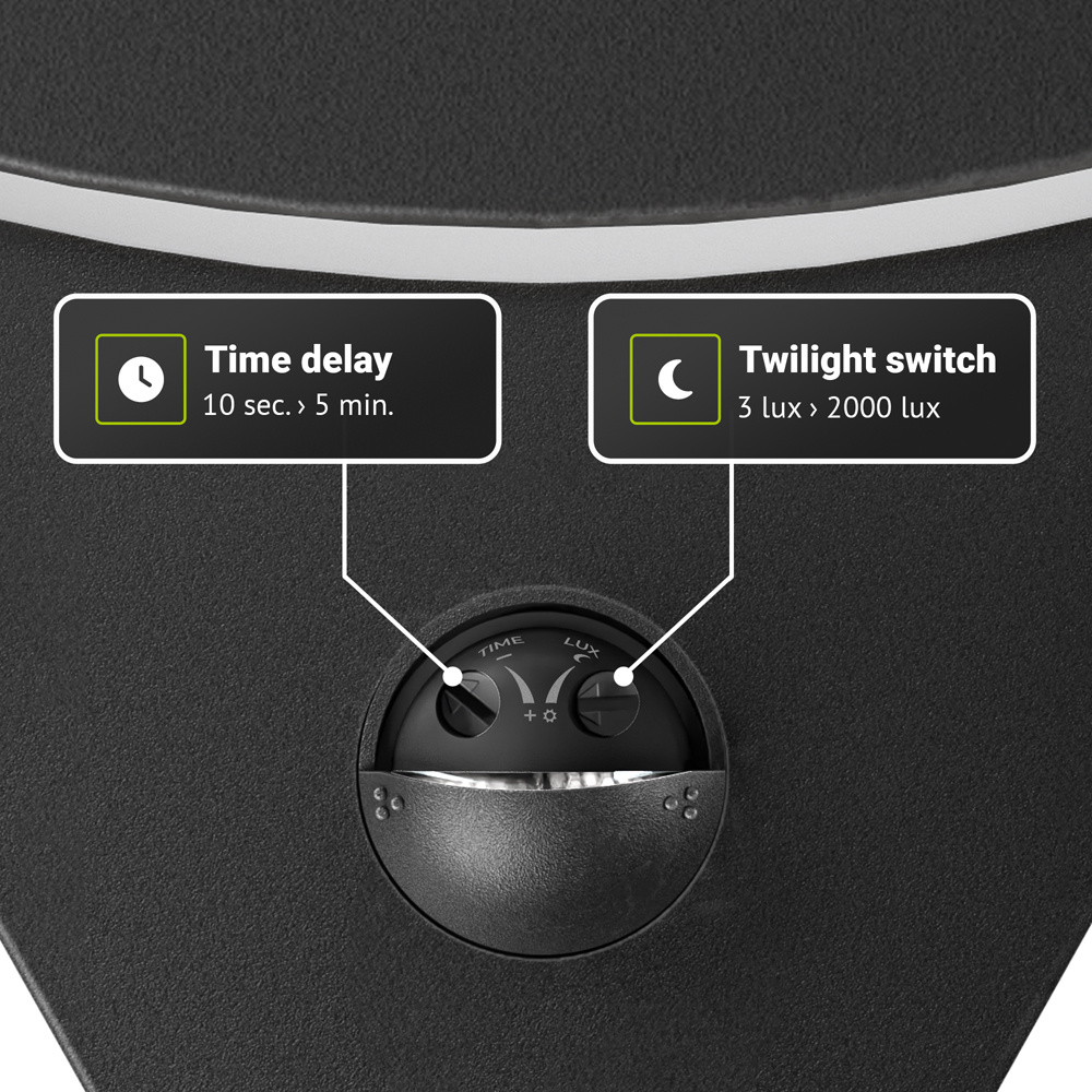 De Leeds LED sensor wandlamp heeft zowel een bewegingssensor als een schemerschakelaar. Hierdoor reageert de lamp wanneer het ’s avonds donkerder wordt, maar zal hij ook aanschakelen wanneer hij beweging detecteert (tot fijn 9 meter). De schemerschakelaar en de tijdruimte zijn beide in te stellen via de knopjes die beneden het kapje van de sensor zetten. Schuif het kapje naar onderen om bij de instel-knoppen te komen. Met de schemerschakelaar kun je het aantal lux instellen. Wanneer je het aantal lux heel gunstig instelt, schakelt de sensor de lamp in wanneer het buiten zeer donkerkleurig is (3 lux). Draai je de knop helemaal naar de zon? Dan zet de sensor de lamp aan wanneer het nog vrij licht is (> 300 lux) zal de lamp bij de minste schemering direct aanspringen. Tot slot kun je mede instellen hoelang de lamp blijft branden nadat hij geen beweging meer heeft gedetecteerd. Hierdoor bespaar je kapitaal en energie aangezien de wandlamp niet onnodig lang blijft branden.
