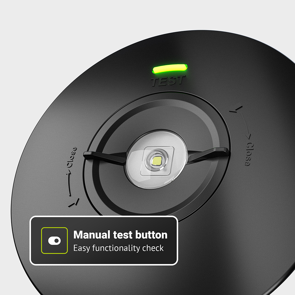 De Locus downlight heeft een testknop waarmee je handmatig kunt controleren of de noodverlichting automatisch inschakelt bij stroomuitval. Het is verplicht om maandelijks handmatig een functietest en jaarlijks een duurtest van drie uur uit te voeren.