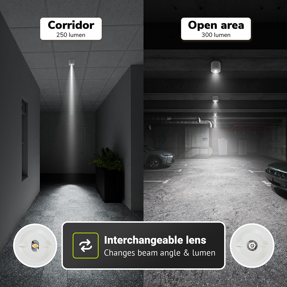 Het handige aan de Locus is dat hij wordt geleverd met verwisselbare lensen waarmee je de lichtopbrengst (het aantal lumen) en de stralingshoek kunt regelen. Wanneer je de downlight in een royale ruimte wilt plaatsen bedien je de standaardlens die zorgt voor een lichtopbrengst van 300 lumen. Voor plaatsing in gangpaden gebruik je de meegeleverde lens met een smallere stralingshoek. Deze zorgt voor een lichtopbrengst van 250 lumen.