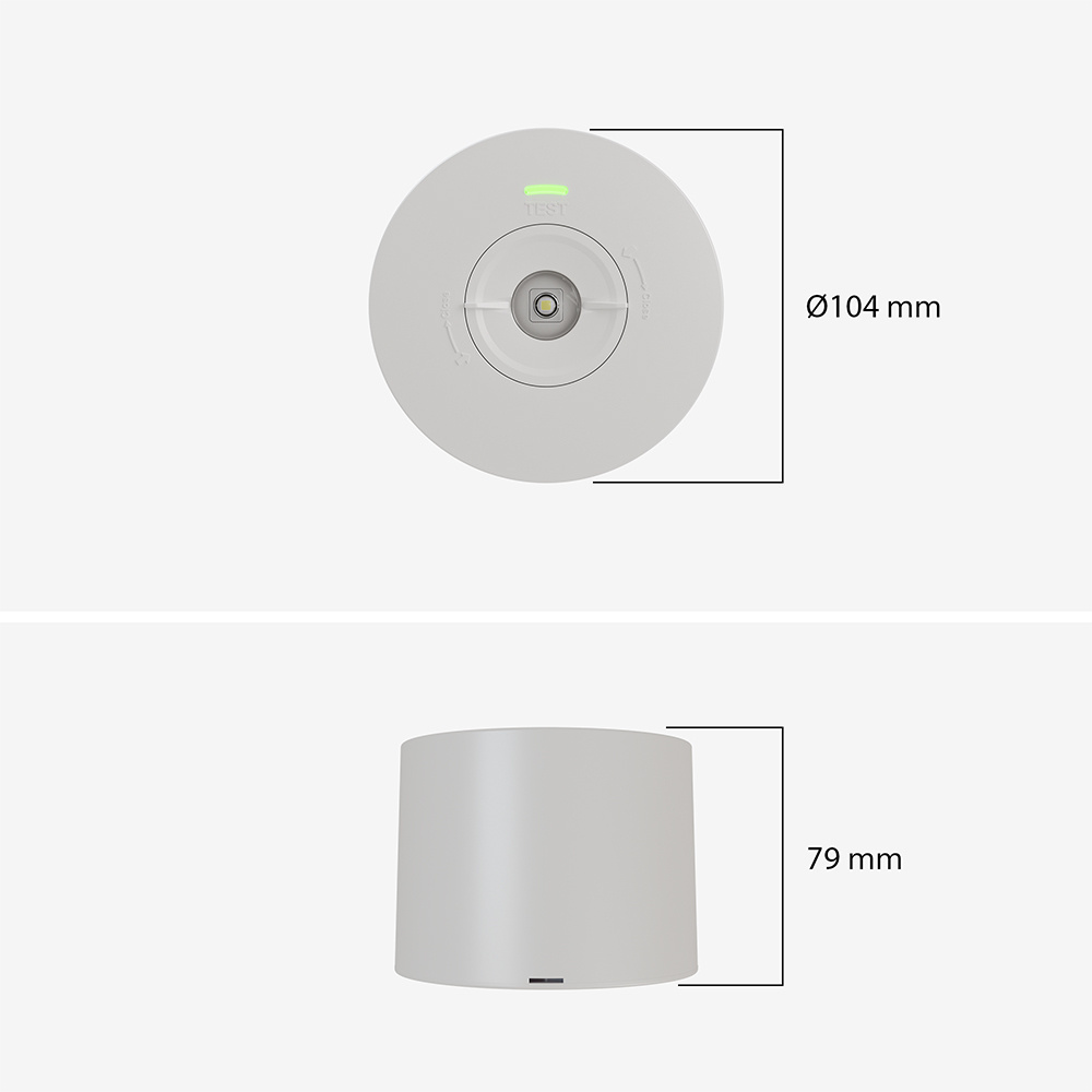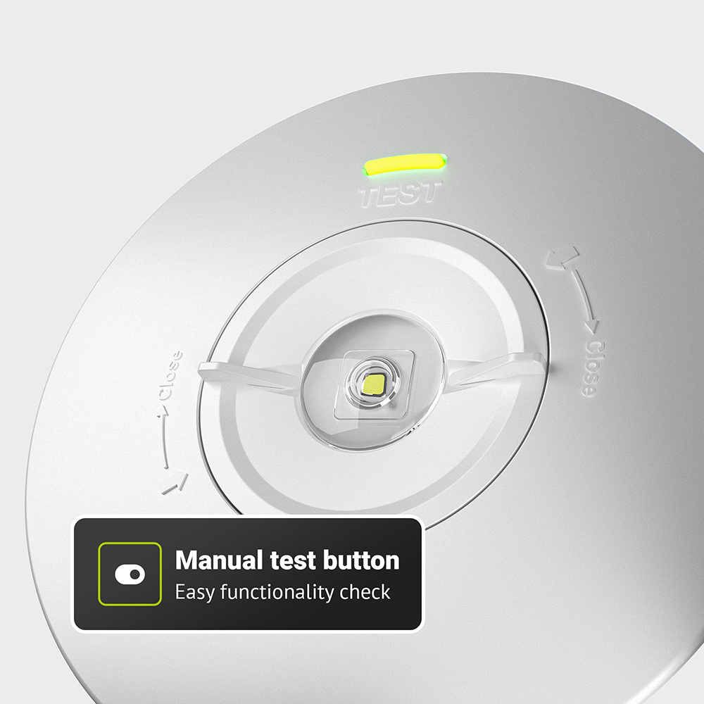 De Locus downlight heeft een testknop waarmee je handmatig kunt controleren of de noodverlichting automatisch inschakelt bij stroomuitval. Het is verplicht om maandelijks handmatig een functietest en jaarlijks een duurtest van drie uur uit te voeren.