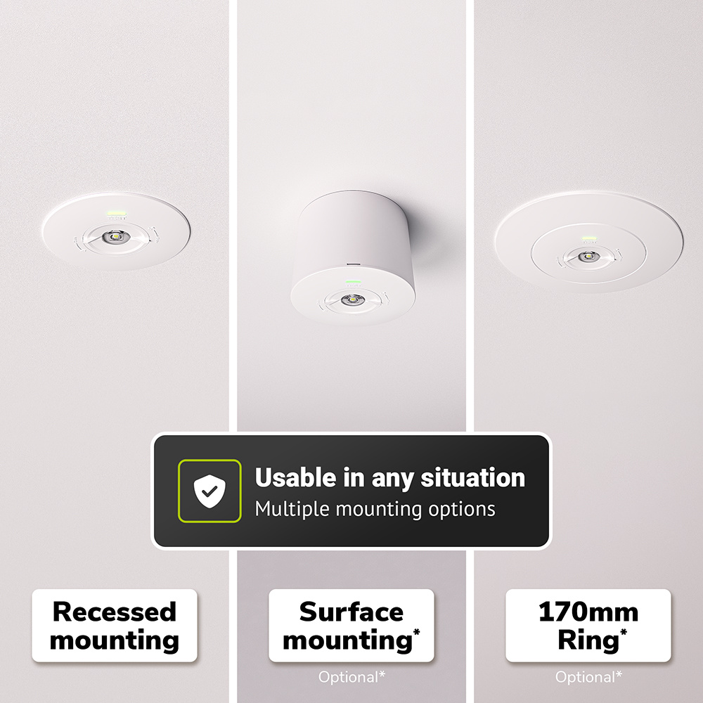 De Locus noodverlichting downlight is comfortabel te monteren met het opbouwframe. Dit doe je door het opbouwframe met de meegeleverde schroeven en pluggen in het plafond te monteren. Vervolgens klik je de downlight eenvoudigweg in het frame.