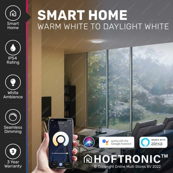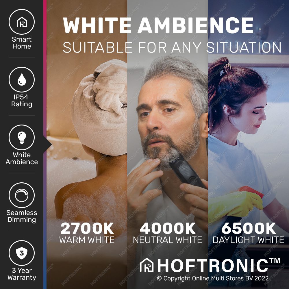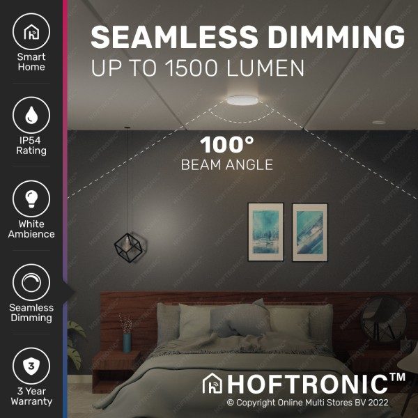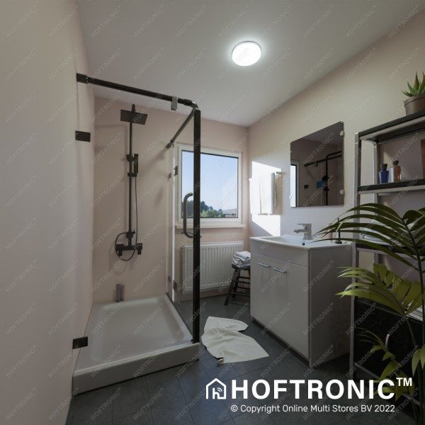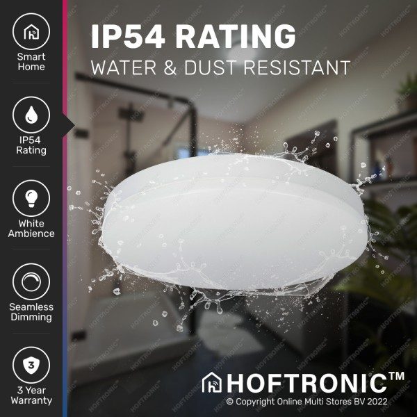 Deze handige slimme plafondlamp kun je door de white ambiance functie overal benuttigen. Hierdoor kun je immers, via je smartphone. selecteren uit alle wit kleuren van 2700K – 6500K. Stel de lamp in op 2700K wanneer je gezellig aan het ontspannen bent in bad. 4000K neutraal wit selecteer je wanneer je voor de spiegel staat om je te scheren of om je make-up te doen en op 6400K wanneer je prettig helder licht nodig hebt bij het schoonmaken. De lamp is algeheel traploos dimbaar en op vol muntgeld schijnt de plafondlamp met een lichtsterkte van 1500 lumen. Voldoende om iedere hoek van de badkamer (of andere ruimte) maximaal te verlichten. De Lumi beschikt over een IP54 beschermingsklasse. Defecten door vocht en stof zijn uitgesloten.