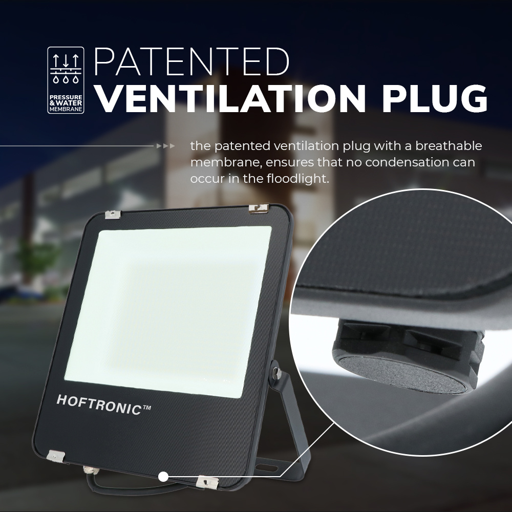 De gepatenteerde ventilatieplug van deze breedstraler heeft een ademend membraan. Dit zorgt voor drukvermindering in de schijnwerper. Hierdoor zal er zelfs bij zeer ultiem weer geen condensatie in de schijnwerper optreden. Tevens is deze schijnwerper voorzien met een aansluitsnoer met een lengte van 1 meter.