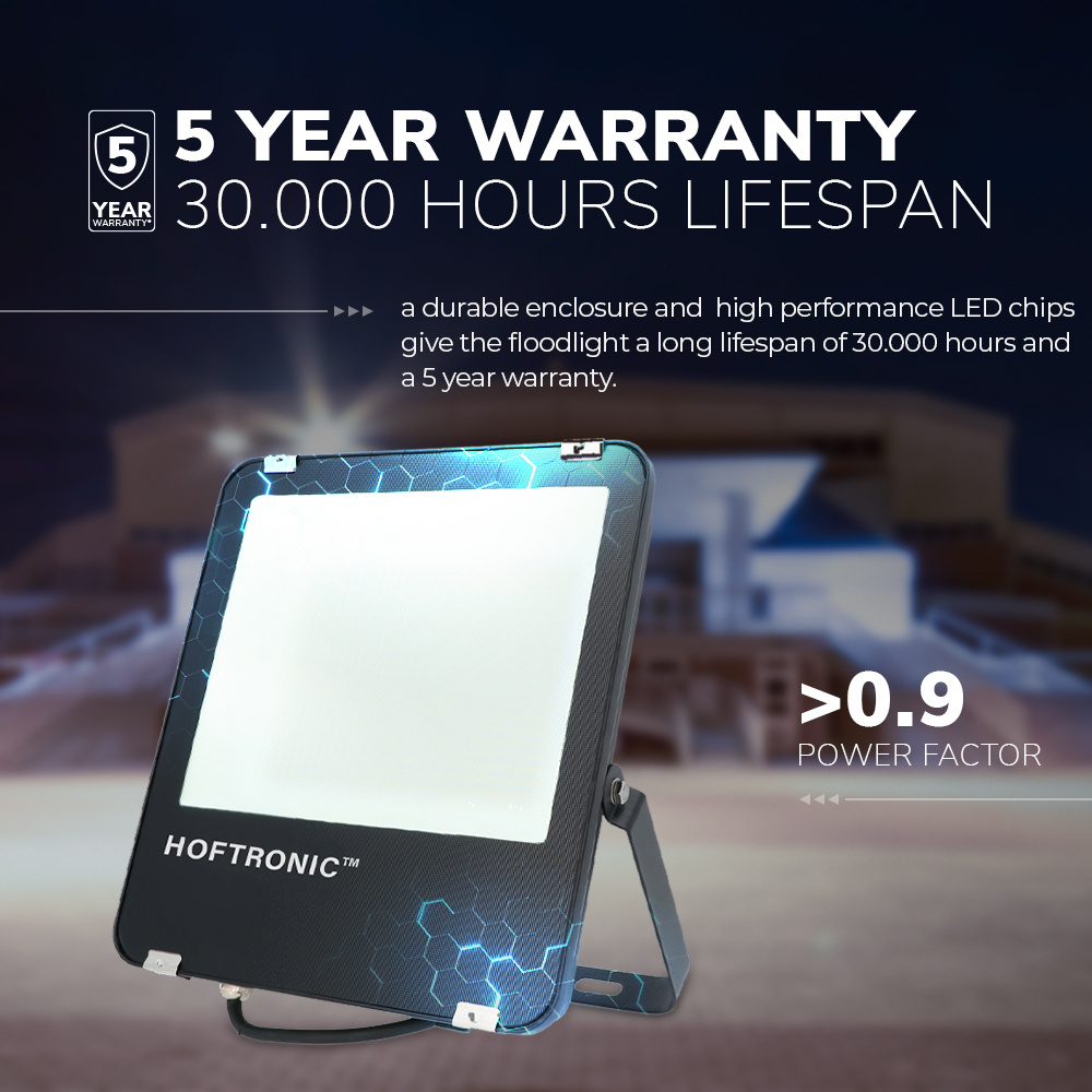 Deze breedstraler is van het kwaliteitsmerk HOFTRONIC. HOFTRONIC is zowel verkoper als producent van LED verlichting. Hierdoor profiteer jij altijd van de scherpste prijs, de mooiste garantie en de hoogste kwaliteit. Mocht je vragen hebben over de montage of de werking van deze breedstraler? Dan zit er een team productspecialisten voor je klaar. Gaat er binnen 5 jaar iets defect aan de schijnwerper? Dan oppassen wij voor een kosteloze vervanging. Dat is de veiligheid van HOFTRONIC.