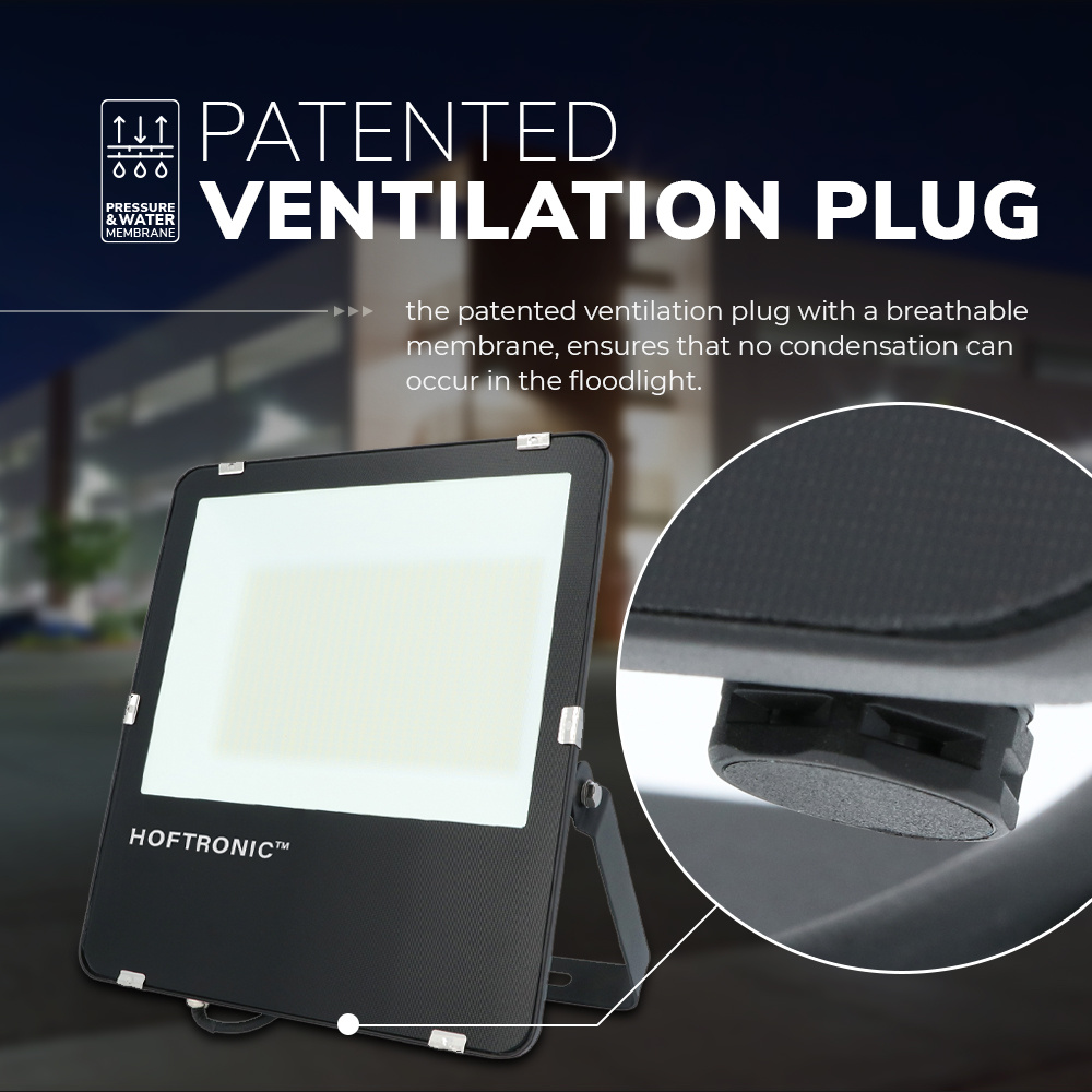 De gepatenteerde ventilatieplug van deze breedstraler heeft een ademend membraan dat zorgt voor een drukvermindering in de schijnwerper. Dit zorgt ervoor dat er bij extreme weersomstandigheden geen condensatie in de schijnwerper kan optreden. Tevens is deze schijnwerper reeds voorzien met een aansluitsnoer met een lengte van 1 meter.
