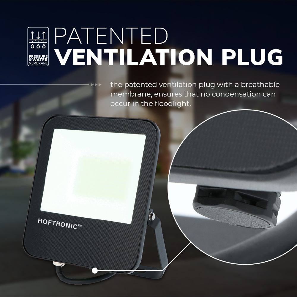 De gepatenteerde ventilatieplug van deze breedstraler heeft een ademend membraan dat zorgt voor een drukvermindering in de schijnwerper. Dit zorgt ervoor dat er bij extreme weersomstandigheden geen condensatie in de schijnwerper kan optreden. Tevens is deze schijnwerper reeds voorzien met een aansluitsnoer met een afmeting van 1 meter.