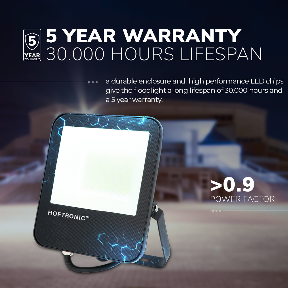 Deze breedstraler is van het merknaam HOFTRONIC. HOFTRONIC is zowel fabrikant als verkoper van LED verlichting. Hierdoor profiteer je van de scherpste verkoopprijs, hoogste niveau en belangrijkste garantievoorwaarden. Op deze LED schijnwerper ontvang je dan mede 5 jaar waarborg. Defecten worden in deze 5 jaar kosteloos substitueren.