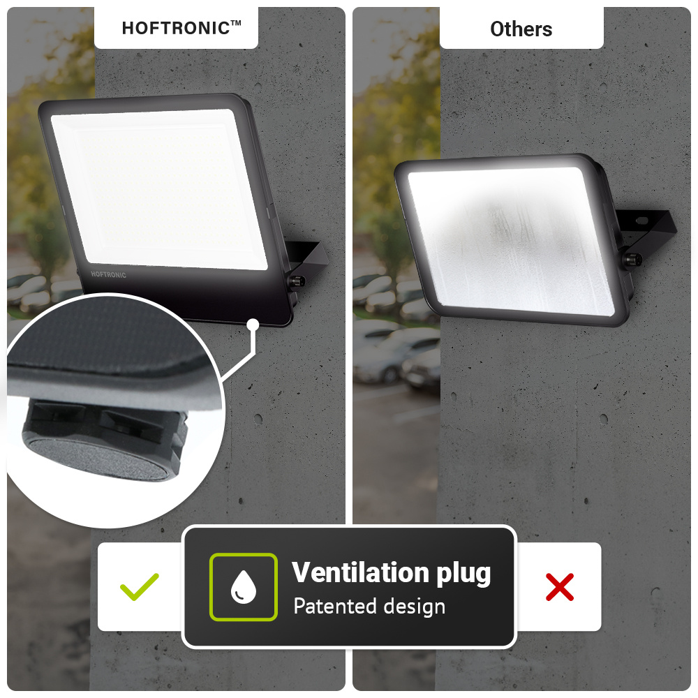 De gepatenteerde ventilatieplug van deze breedstraler heeft een ademend membraan dat zorgt voor een drukvermindering in de schijnwerper. Dit waakt ervoor dat er bij extreme weersomstandigheden geen condensatie in de schijnwerper kan optreden. Tevens is deze schijnwerper reeds voorzien met een aansluitsnoer met een lengte van 1 meter.