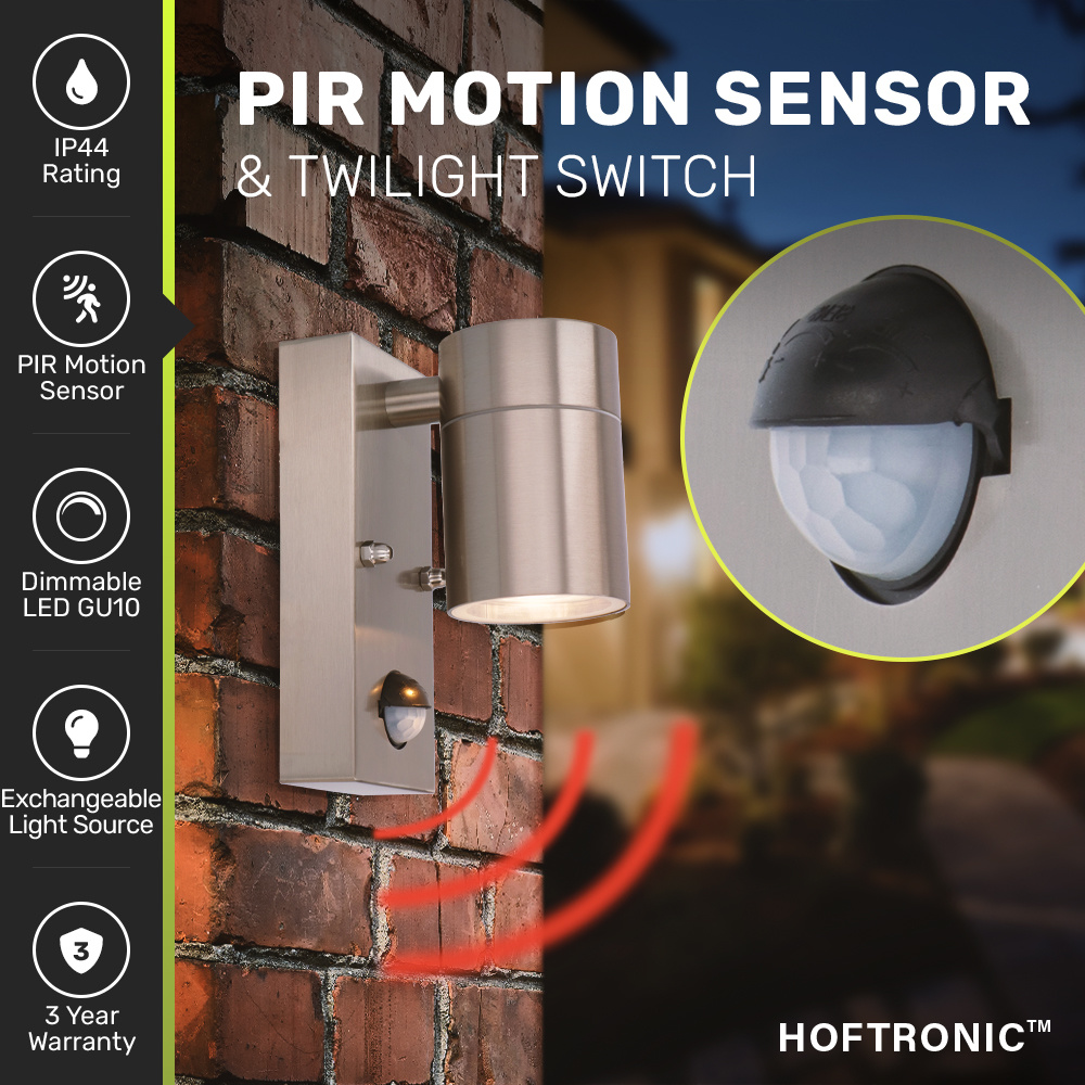 HOFTRONIC Mason wandlamp – 2700K warm wit – Bewegingsmelder en schemerschakelaar – IP44 spatwaterdicht – Spotlight voor binnen en buiten – RVS