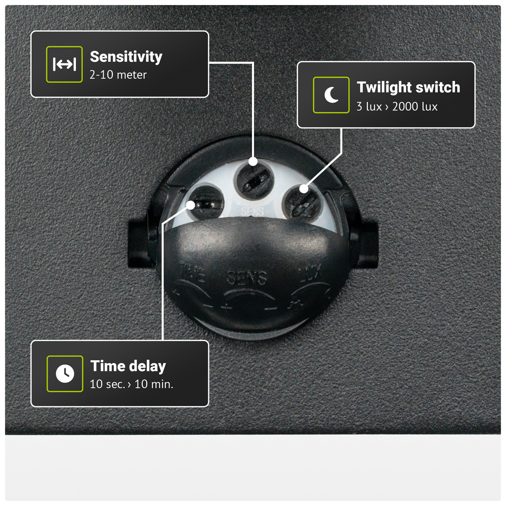 De bewegingssensor stel je in op vertragingstijd en detectie afstand.
