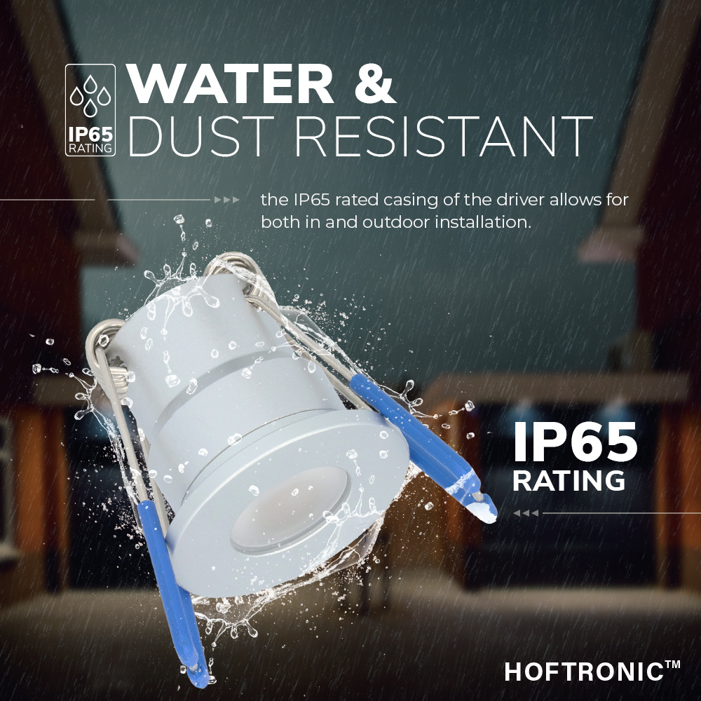 De dimbare driver beschikt over een IP20 beschermingsgraad. Hierdoor kun je deze niet zomaar in een vochtige ruimte plaatsen. Buiten is er altijd een verhoogde luchtvochtigheid aanwezig waar de transformator niet tegen bestand is, zelfs niet beneden een afdak. Plaats deze daarom continu op een droge plaats of in een IP65 waterdichte lasdoos.