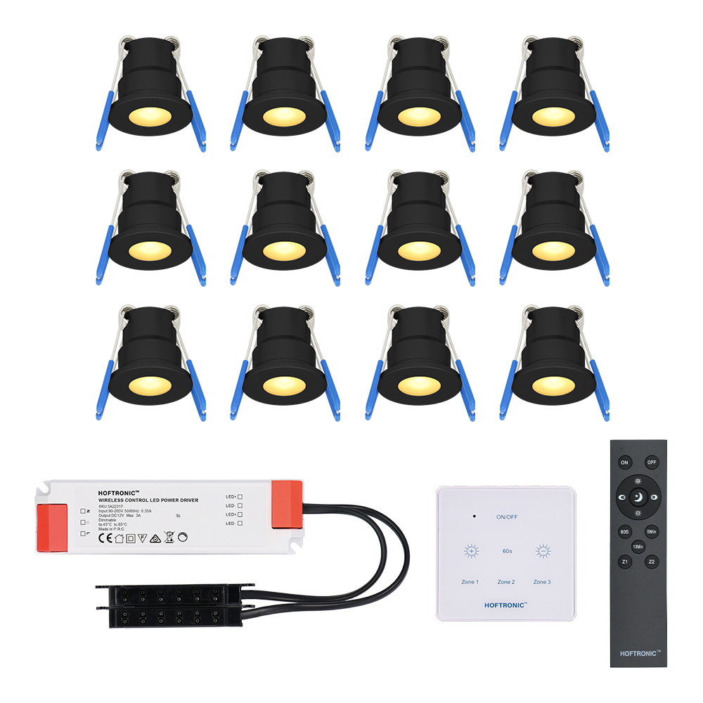 Breng warme sfeerverlichting aan in je veranda met deze totale set Milano LED inbouwspots. Deze set bevat 12 luttele dimbare Cree LED inbouwspots van 3 watt. De stijlvolle zwarte inbouwspots hebben een warme lichtkleur van 2700K en een lichtsterkte van 200 lumen waarmee je de ideale stemming kunt creëren. Door de beschermingsklasse van IP65 zijn de LED-inbouwspots waterdicht waardoor ze niet alleen prima zijn voor buiten, maar voor elke vochtige ruimte onder andere de badkamer. De set wordt verder gebracht inbegrepen dimbare transformator, afstandsbediening, muurdimmer, verdeler en 5 meter kabel per inbouwspot. Blijf harmonieus zitten terwijl je de spotjes bedient met de afstandsbediening. Hiermee dim je de spotjes of schakel je ze aan- of uit. Deze set is tevens leverbaar als set van 4, 6, 8 en 10 spots.