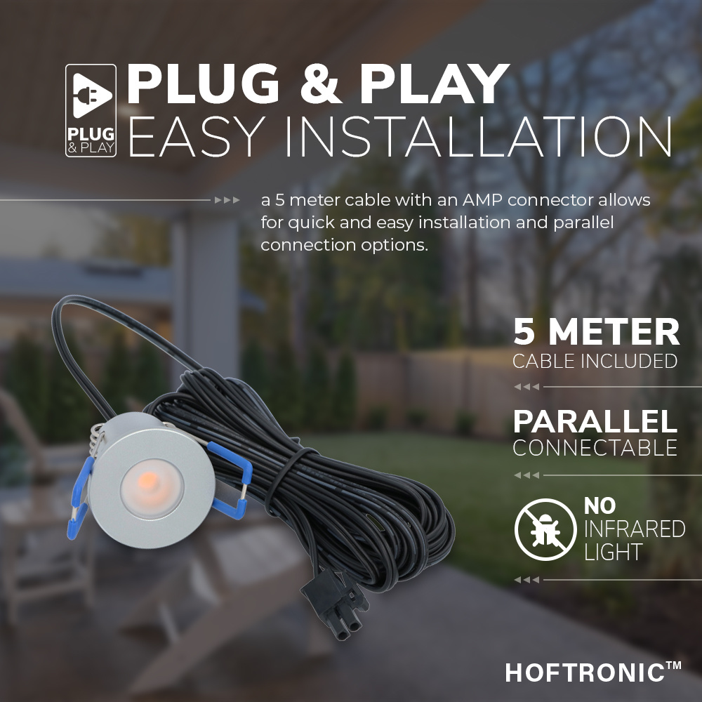 Deze Milano Cree LED spots zijn voorzien van een Plug & Play stekkerverbinding wat het installeren tot kinderspel maakt. De inbouwspots hebben klemmen waardoor ze moeiteloos te ruimtes zijn. De transformator is aan de 230V zijde voorbereid met een 15 cm lange kabel. Deze kun je rechtstreeks op de netspanning aansluiten of er een netsnoer van de gewenste lengte op aansluiten. De spotjes beschikken over een 5 meter lange kabel met AMP-connectoren (deze lijken op korte internetkabel-aansluitingen). Deze prik je moeiteloos en afgezien van behoeften in de driver. Heb je meer kabel nodig? Dan kun je de kabels comfortabel verlengen met een extra verlengkabel van 2 of 4 meter. Deze klik je op dezelfde aanpak aan de aansluitkabels van de inbouwspots.